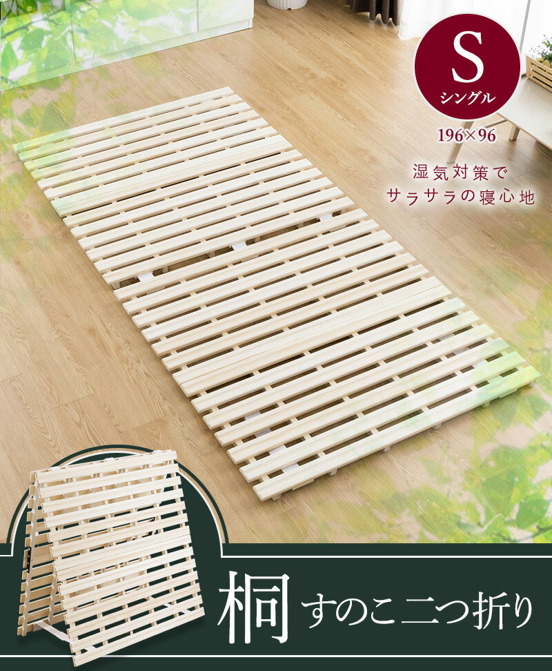 商品名 二つ折り 桐すのこ シングル マットレスセット サイズ 〔すのこ〕 縦:約196×横96×高さ3.8cm(シングルサイズ) 〔マットレス〕長さ195×幅97×厚み20cm 仕様 〔すのこ〕 素材:天然桐材 滑り止め:EVA 〔マットレス〕 外装生地:ポリエステル100% 本体:ポケットコイルスプリング コイル数(シングル495個) 詰め物:ウレタンフォーム、不織布、硬質綿、フェルト)