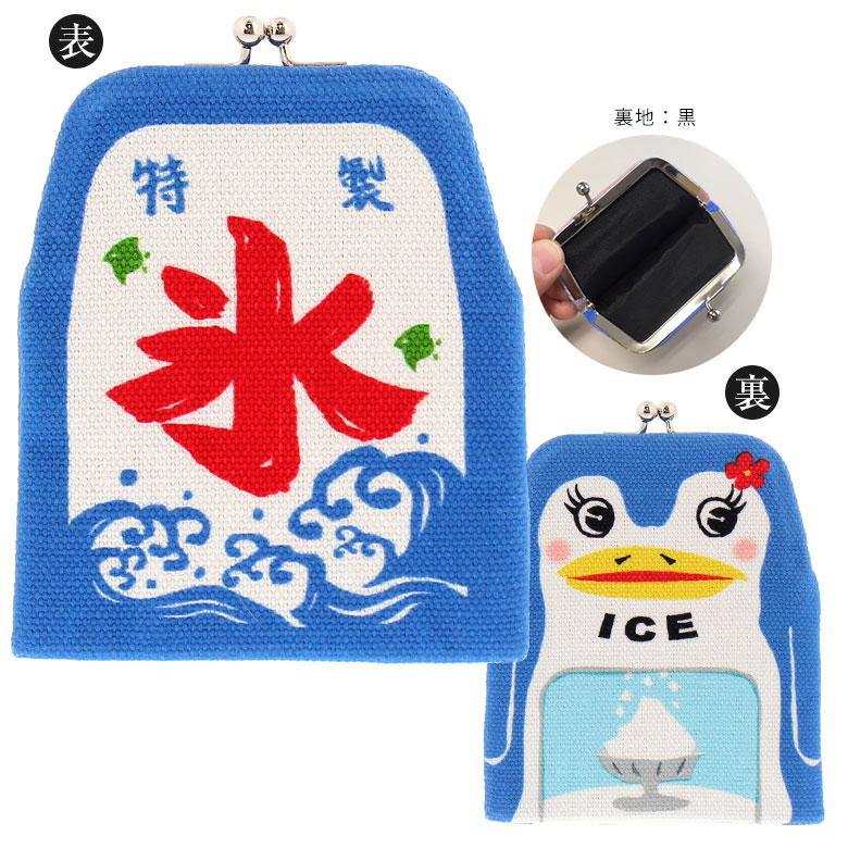 オモテ面にかき氷屋の暖簾、ウラ面には昭和レトロなかわいいペンギンのかき氷機。