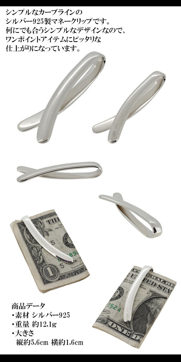 シンプルカーブライン シルバーマネークリップ 925 シルバ- Smart MoneyClip 銀製札挟み プレゼント 人気 おしゃれ